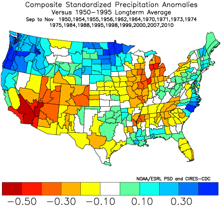 And in this second image, we’re looking at the precipitation during a La Nina fall (September-Novemeber). And where’s the biggest chunk of the U.S. likely to be extra wet? You can see it in blue: pretty much all of Oregon and Washington. Ahh, that explains our wet October where many northwest cities are about 150% of average rainfall for the month. So, that’s what La Nina years typically mean in fall–and these have played out perfectly in October with an unusually cool and wet month underway.