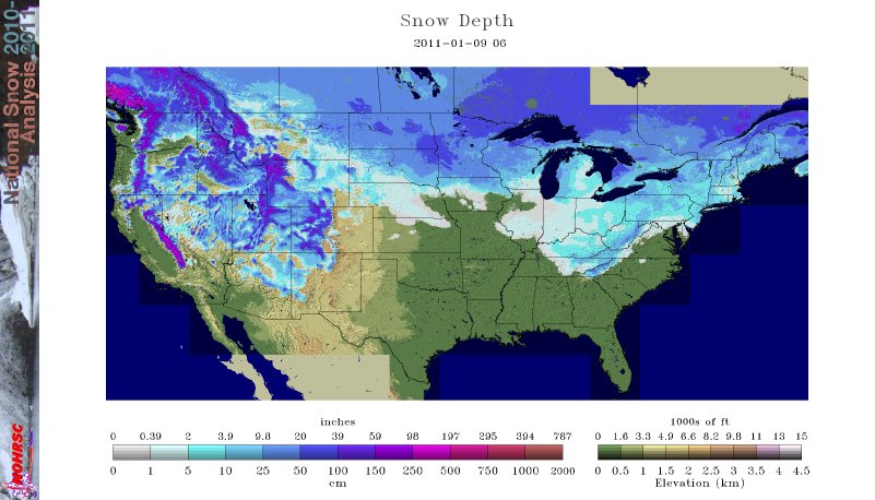 Now, to the national maps. Here’s U.S. snow pack on January 9, 2011 (one year ago):