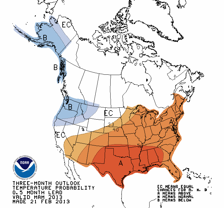 The answer is no–and yes–in that order according to the latest NOAA issued 90 day forecasts which cover March, April and May 2013 rain and temperature outlooks across the United States.