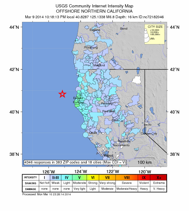 As this map shows, the earthquake was felt throughout the San Francisco Bay Area and in Oregon as far north as Eugene, home of the Oregon Ducks.
