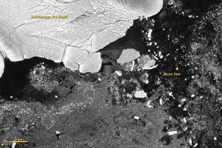 A NASA summary of this event puts it like this: “Using satellite radar data, scientists recently observed the calving of several large icebergs from the Sulzberger Ice Shelf along the Antarctic coast as a result of the March 2011 tsunami half a world away in Japan. Scientists have long speculated that ocean waves could cause an ice shelf to flex and break, but this is the first time researchers have observed a tsunami having this effect.”