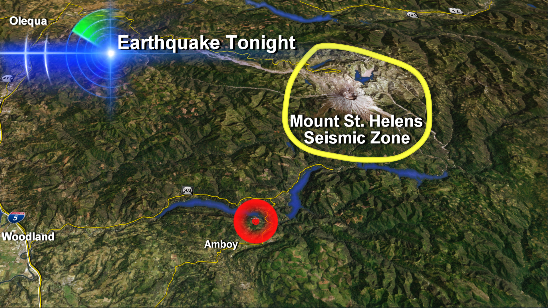 A funny thing happened on my way to doing the 5 o’clock weather forecast: an earthquake hit a single mile northeast of Amboy, Washington and was felt as far away as Vernonia in the Coast Range, Sherwood on the metro area’s west side and Oregon City on the metro area’s east side.