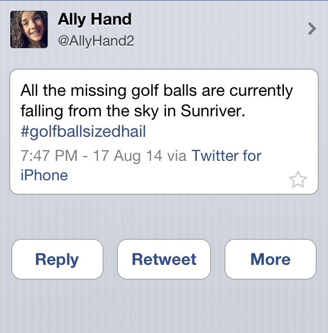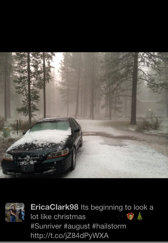 Be jealous of watching the storm here in Sunriver, but don’t be jealous of being stuck out in the hailstorm at the tail end of a bike ride….I have the bruises & welts to prove I was pelted by hail!!!! My husband, 10 year old & I took cover in some trees. After waiting out the hail, we made it to the safety of a house on Deschutes Lane….We are ever grateful to Bill & Carolyn for taking us into their home, helping us dry off, letting our 10 year old take a hot shower, giving us hot tea & dry clothes before driving us back to out vacation home….They truly are our Sunriver heroes!!! (Tomorrow we’re heading back home to Milwaukie, but we will always remember our Sunriver thunderstorm experience!!!)