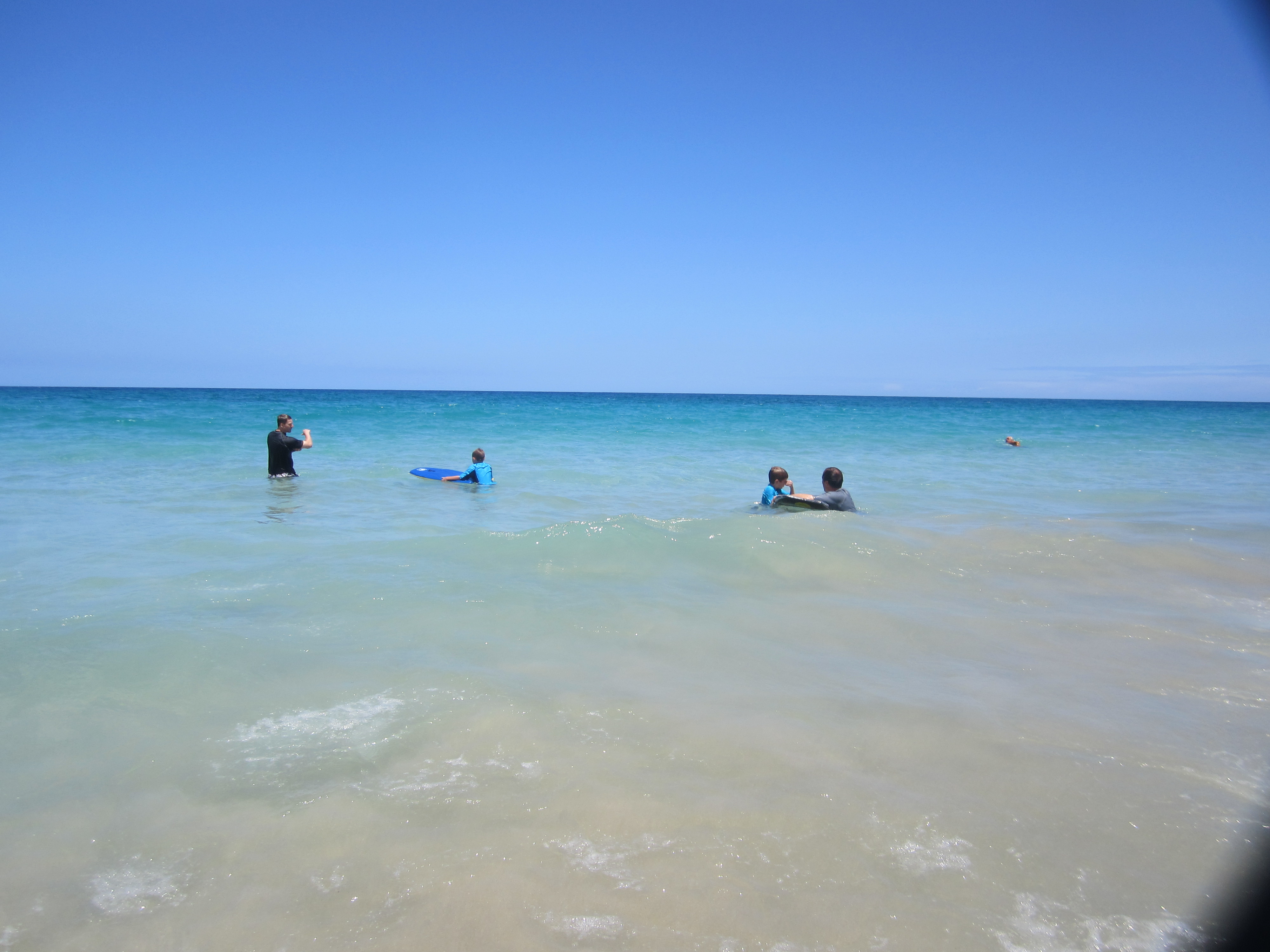 In this photo (left to right): my brother in law, teaching our oldest son to boogie board, then my youngest son that I was teaching–and finally me on the far right.