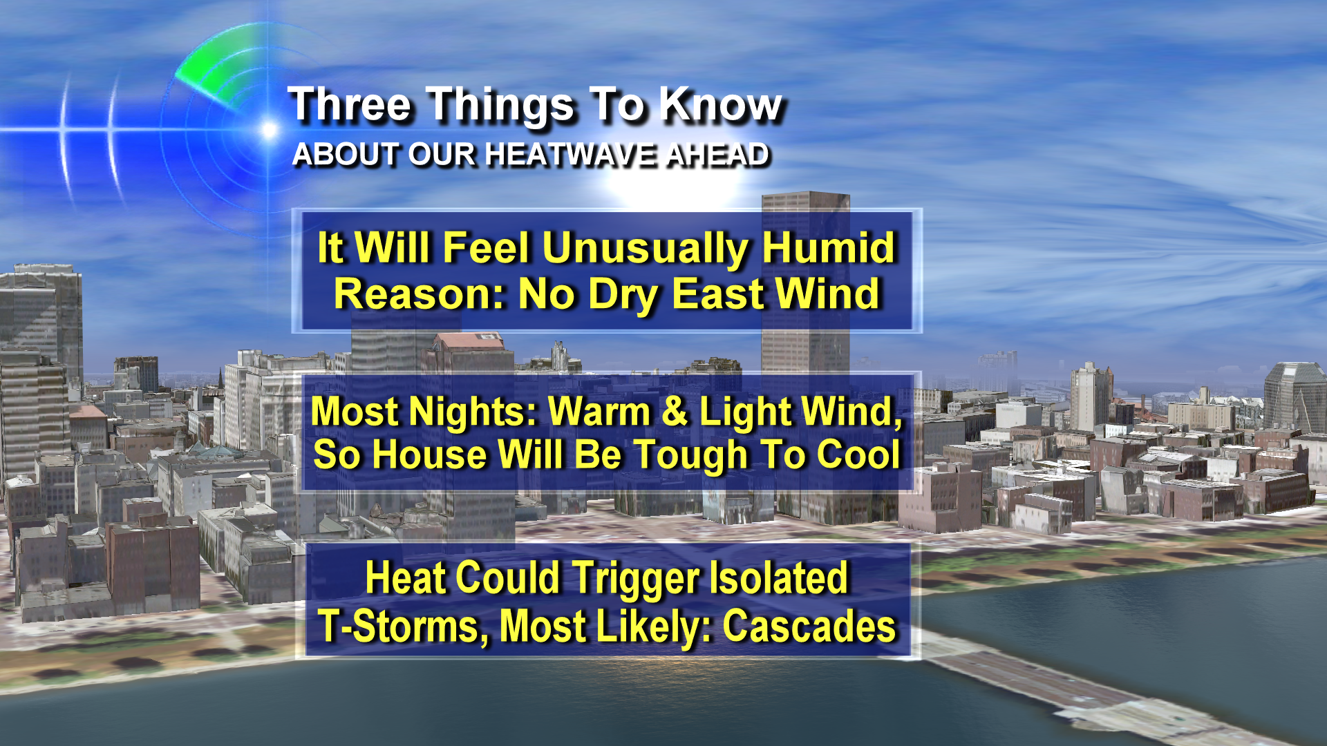 Here are some important ‘highlights’ of our heatwave. Bottom line: if you do not have a/c at your place…make friends with someone who does. Or head to the coast…where highs will be 65 to 75 degrees with a lot more in the way of clouds!