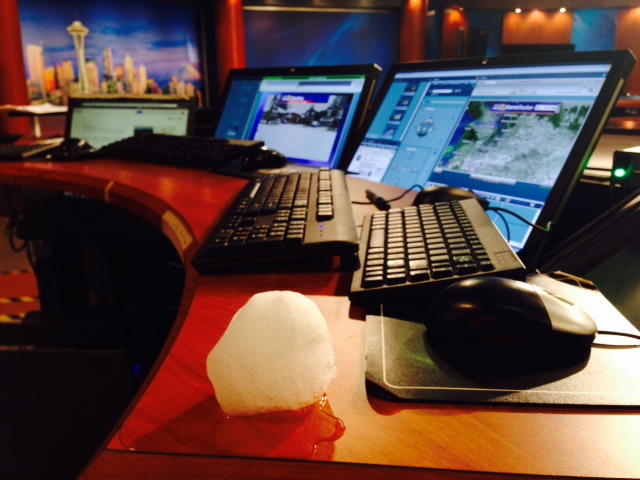 kiro-7-snowball The Morning and Noon Meteorologist at KIRO7 – @MorganKIRO7 brought in a snowball from the station parking lot. Hopefully the IT guys don’t see this shot–I might have put the thing a little close to expensive technology!