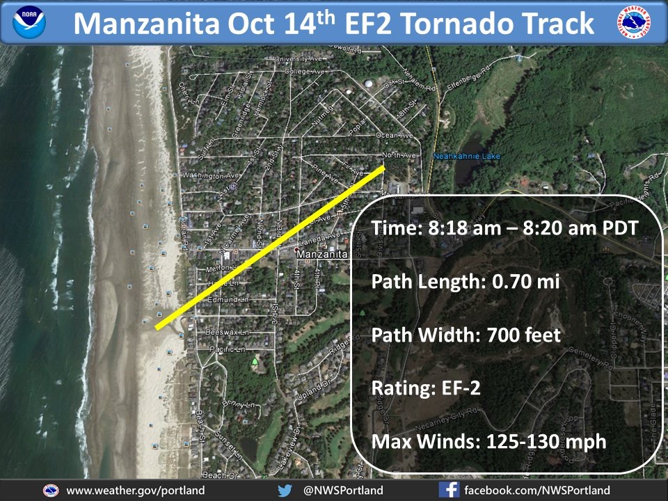 Tornado winds were 125-130mph. And here’s a map of the Manzanita tornado track. Tornado investigators from the National Weather Service Office in Portland surveyed the damage, classified the Tornado and created this map of the track.Â