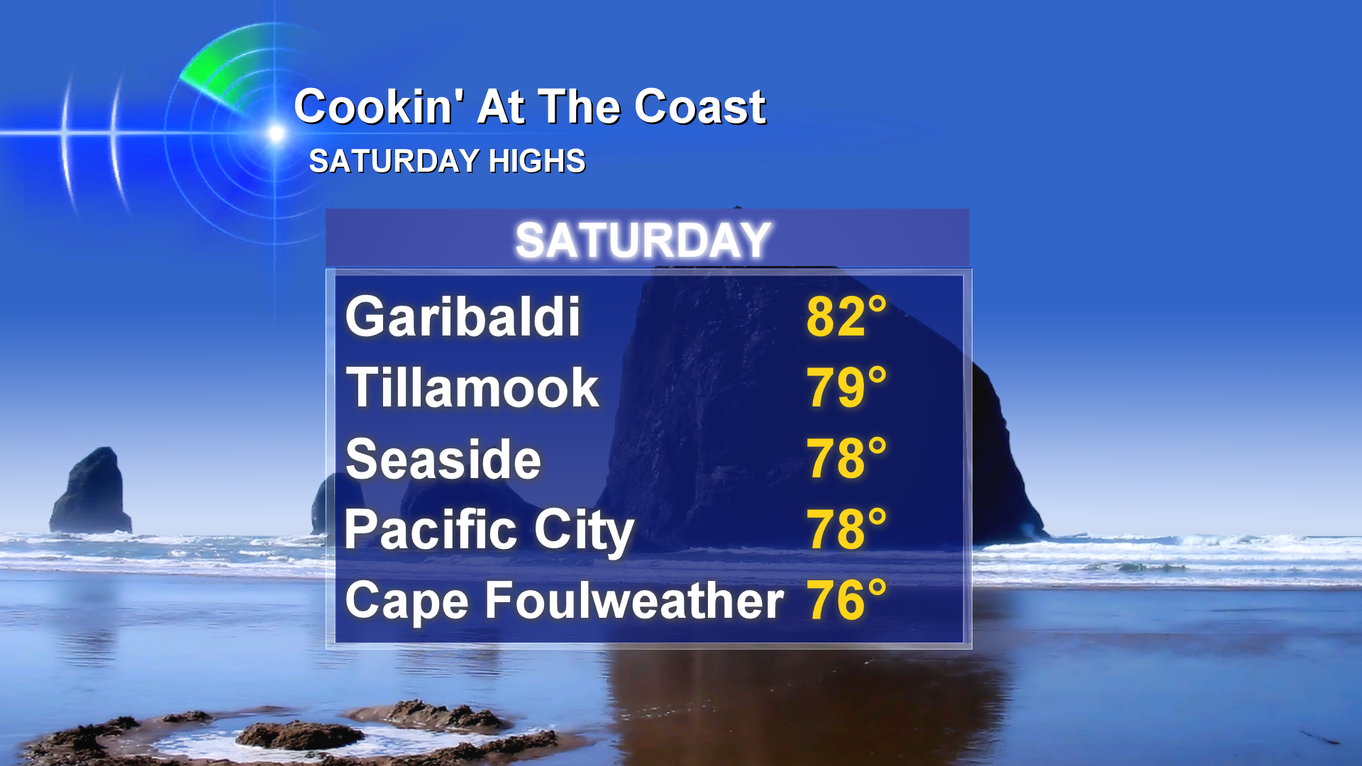 And anytime I can title a graphic “Cookin’ At The Coast” I take full advantage of it. I mean 78 degrees in Seaside? Why couldn’t that have happened when our family was over there for spring break earlier in the week? Is it the weatherman’s curse? And then there’s Cape Foulweather at 76 degrees. Obviously, NOT named on a day like this!