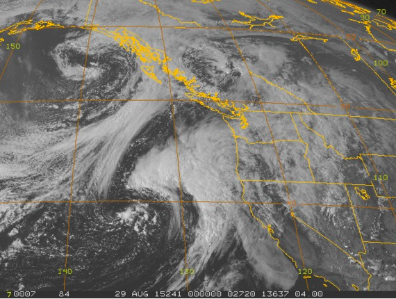 However, we do have a doozy of a fall storm that’s going to roar through on Saturday. It’s the one to the southwest of Oregon in this image from Friday afternoon August 28, 2015. And it is followed by it’s weaker–and cooler cousin–which you see to the northwest of our coast line on the map.