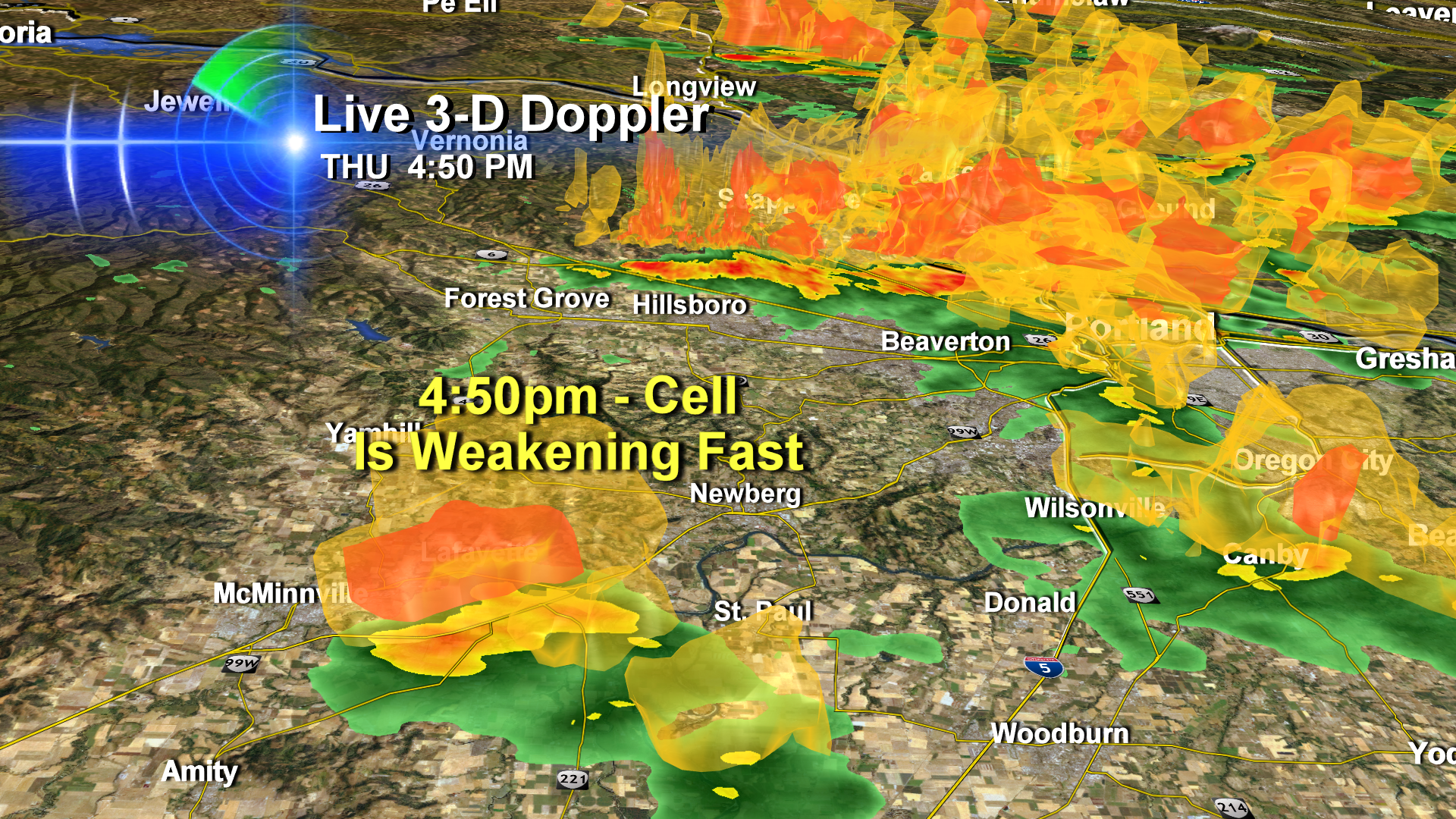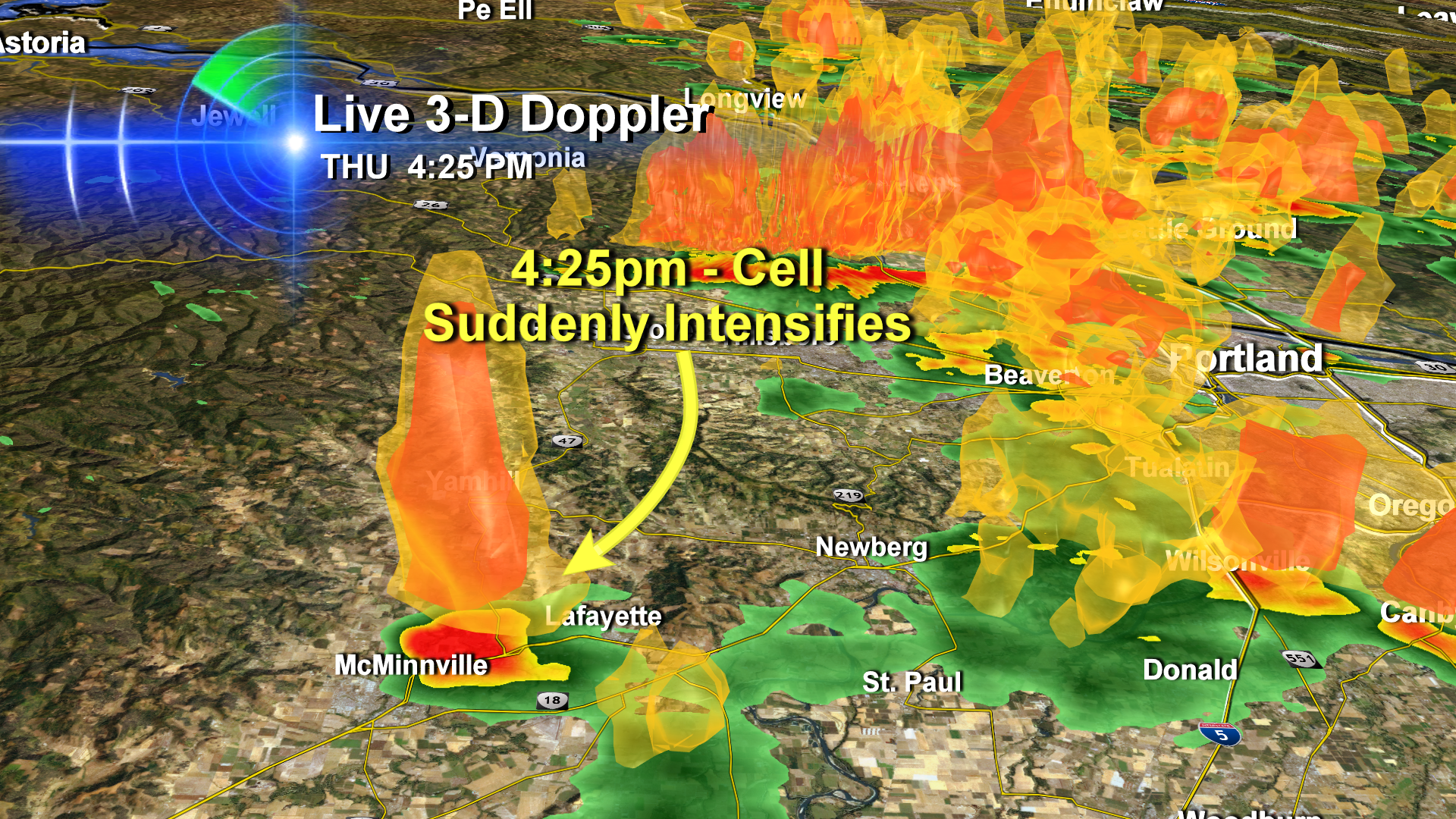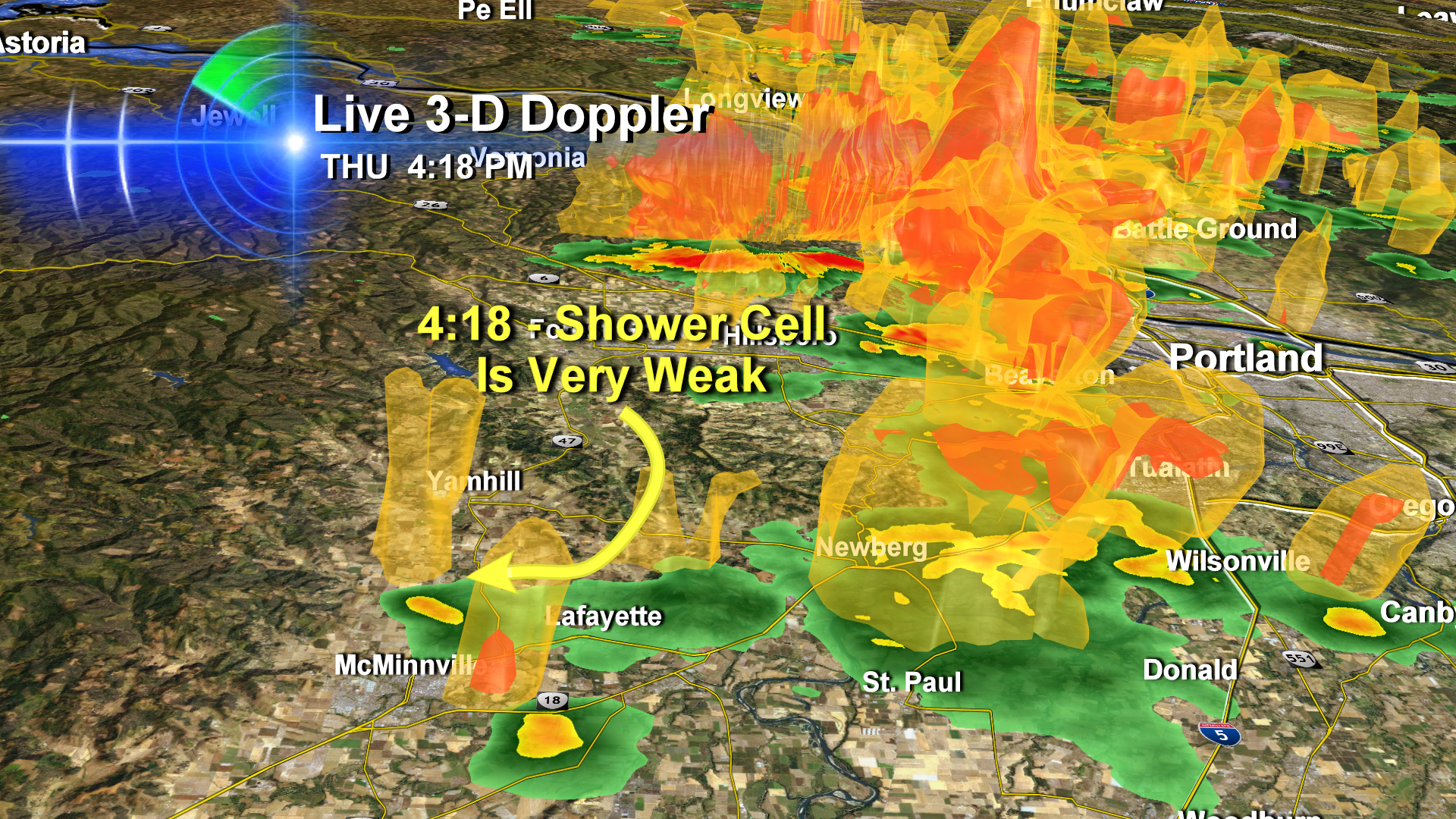 At 4:18pm, I was much more interested in the showers over Beaverton, just west of Portland. You can sure see why on our 3-D Doppler. The McMinnville cell was basically nothing.