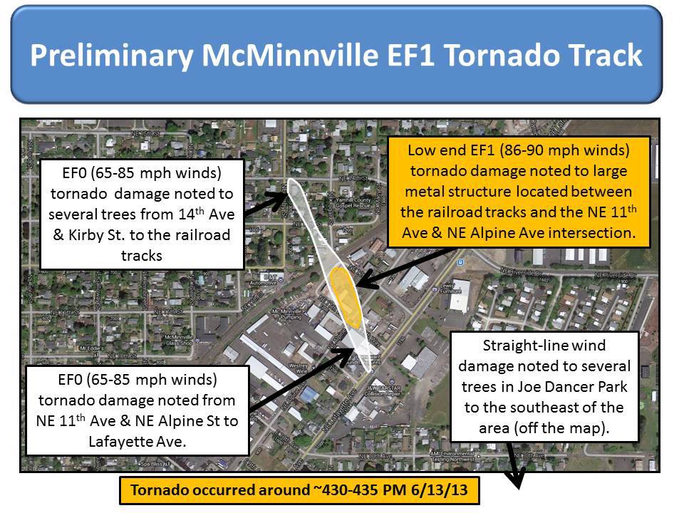 Here’s the tornado track and damage map put together by the National Weather Service in Portland. Investigators from this office raced down to McMinnville as soon as reports came in of the damage and possible tornado. The tornado track was from NNW to SSE or top to bottom on this map.