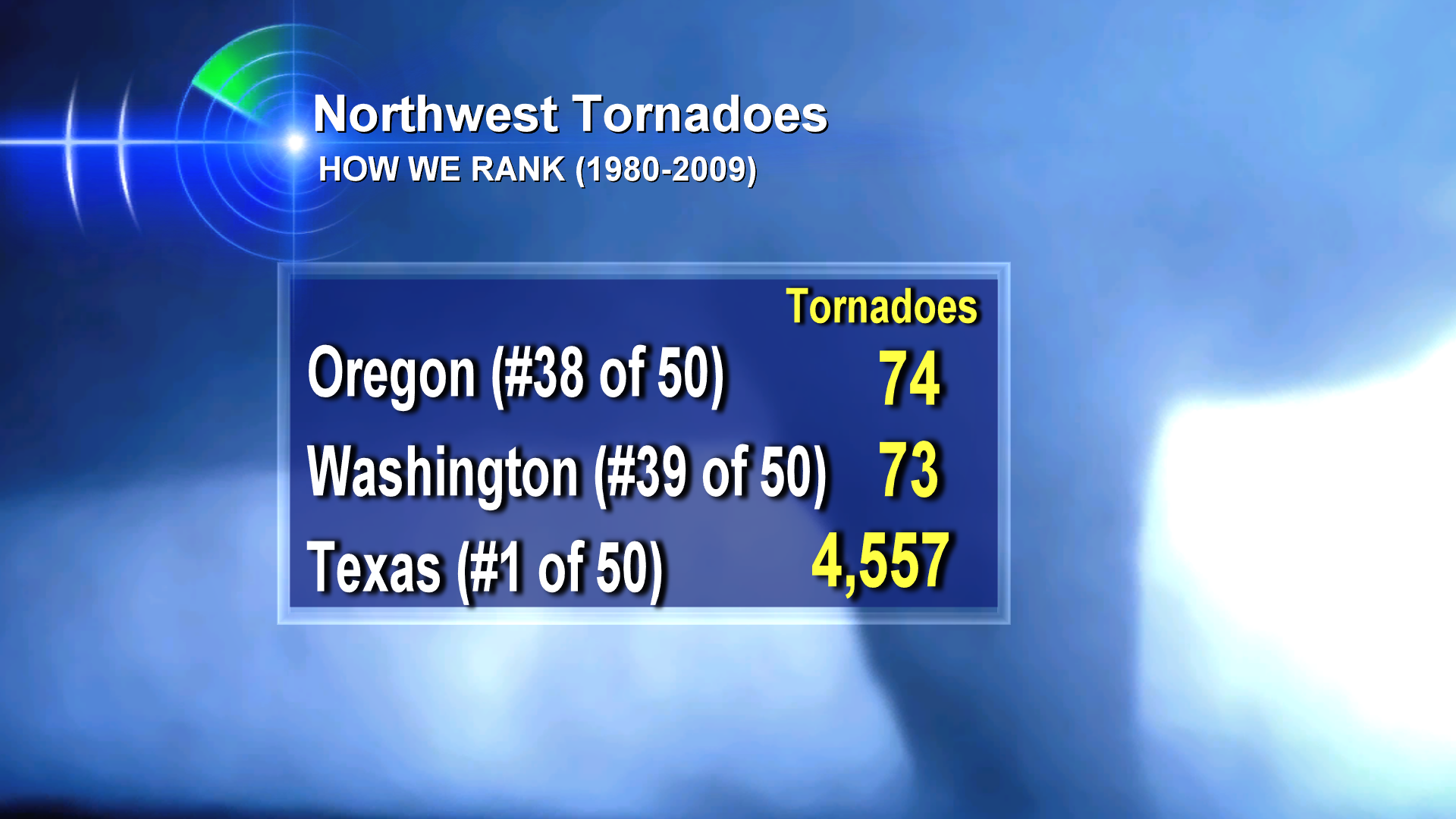 If you’ve lived here for long–you know an Oregon or Washington tornado is a big deal. Anytime they happen! I did some digging in the Storm Prediction Center’s tornado database and this is how Oregon & Washington rank for total number of tornadoes from 1980-2009, the most recent compiled stats I could find: