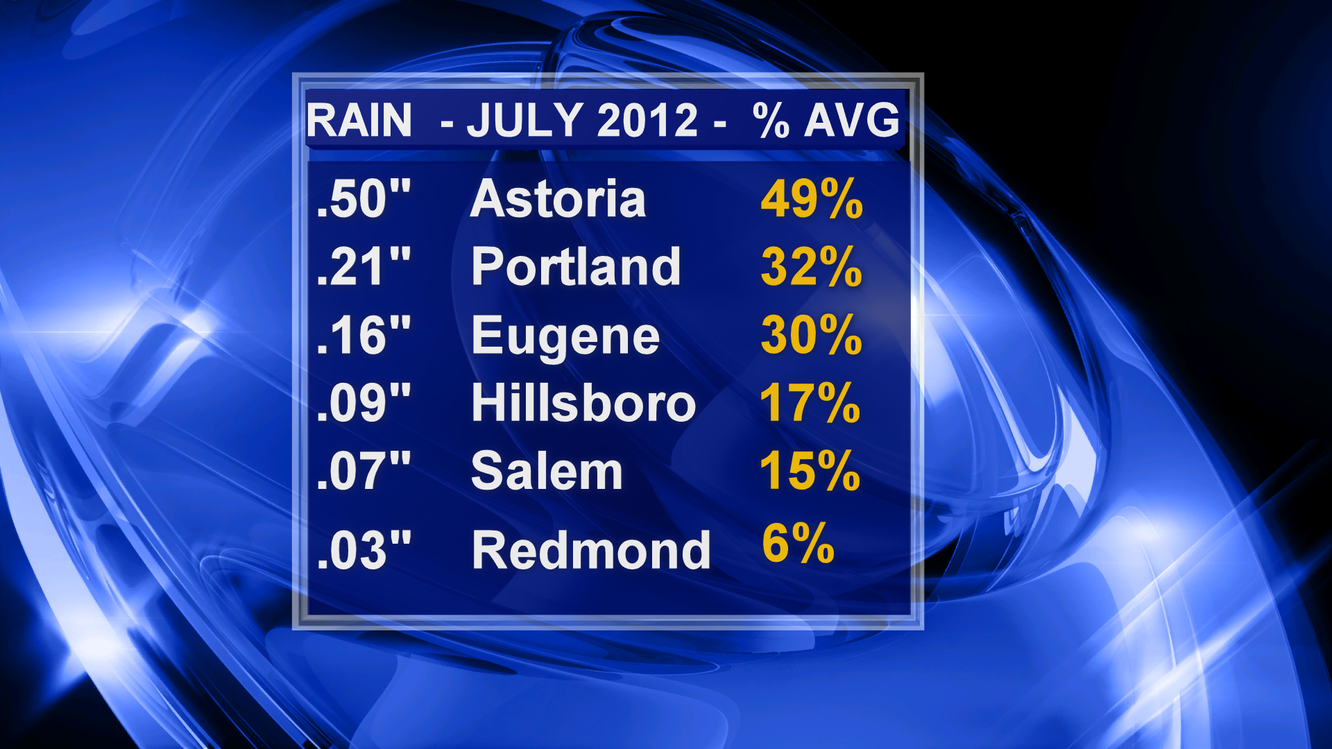 Hillsboro had just 17% of its average July rainfall, Salem had 15% of its average rainfall in July 2012 and Redmond only 6%. Now that’s what I call a ‘dry July’!