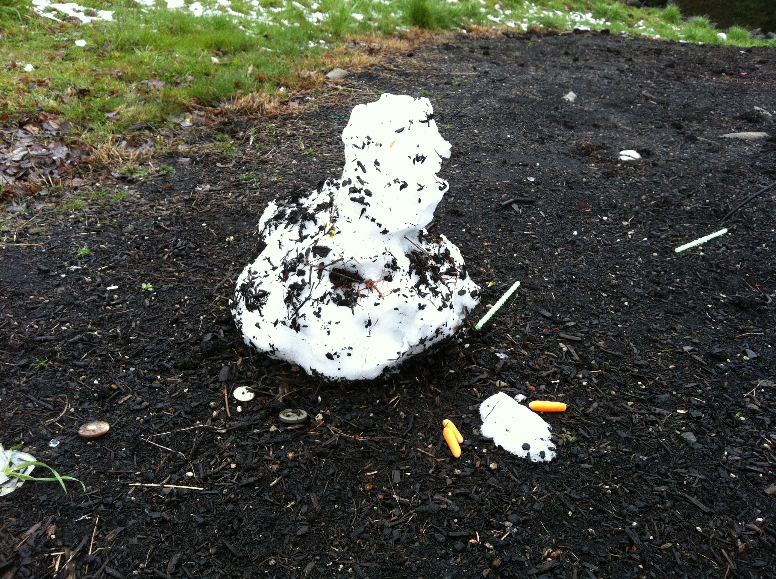 Carrot eyes, straw arms and buttons (yes, actual buttons) mercilessly ripped from frosty’s body by warmer weather and rain.