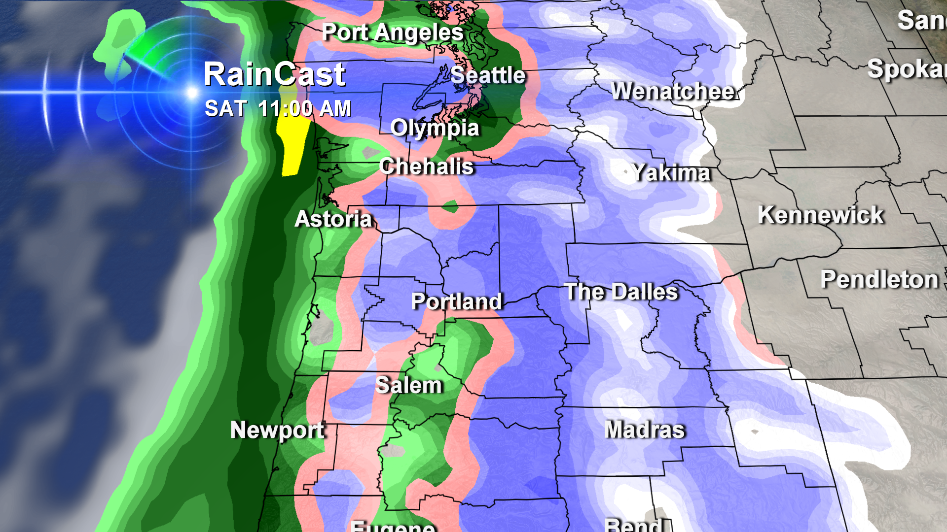 Here’s our rain & snowcast for Saturday morning at 11am. It’s probably over-playing low elevation snow in Clark County–but the idea is good, it’s ALMOST cold enough for snow at the lowest elevations. And hilly areas may indeed get a taste of winter! (Note: it’s possible even colder air comes in at some point during the Tuesday-Thursday timeframe. That’s still a long way out there though…but it’s worth watching.)