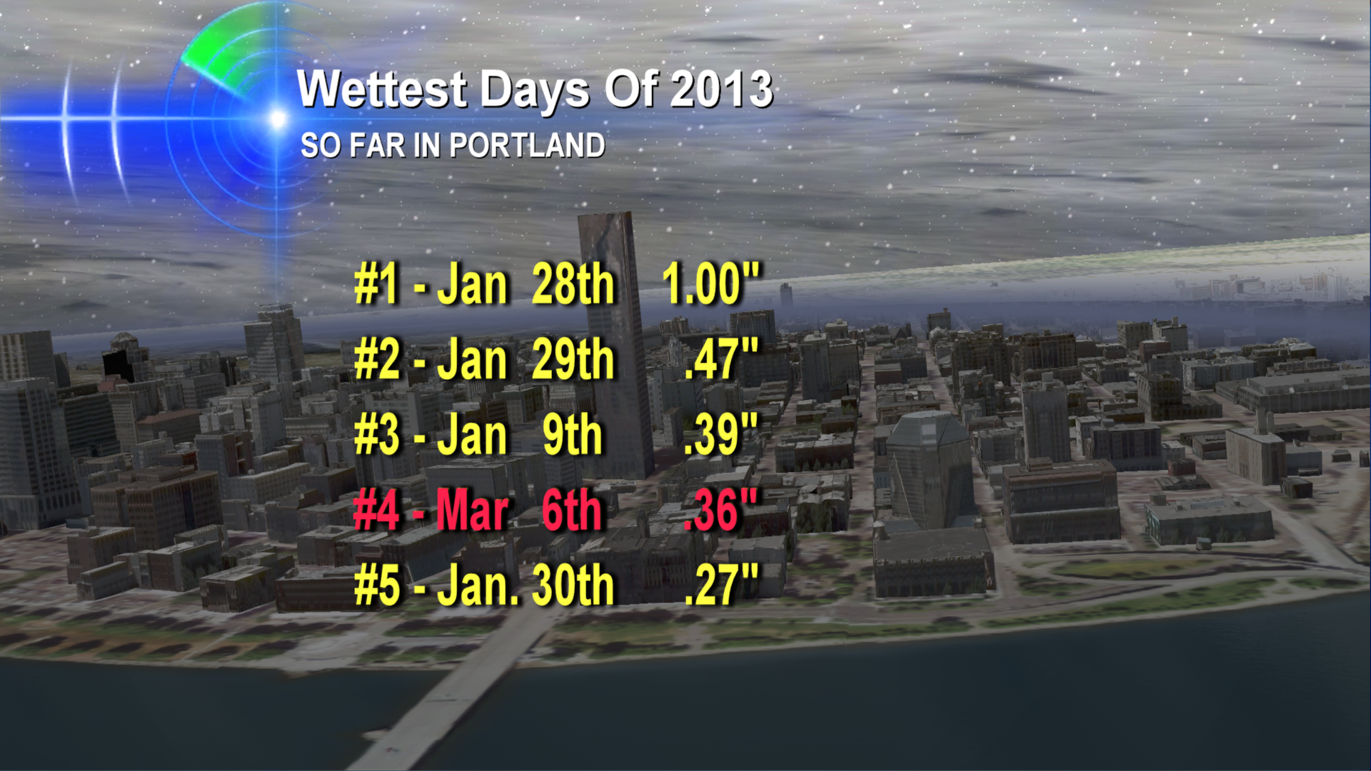 Inland, well, we went from very wet all day to not as wet in the evening. No sweet sunset views. But in Portland, we’re putting March 6th down as the fourth wettest day of 2013 so far.