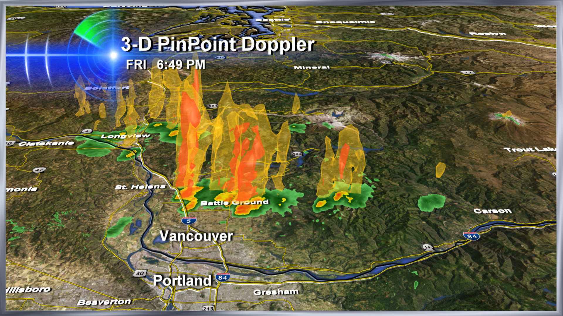 For the first time in weeks, I used 3-D Pinpoint Doppler as clouds that created sprinkles over the Portland metro area–turned into downpours over Battleground. Look at those towers!