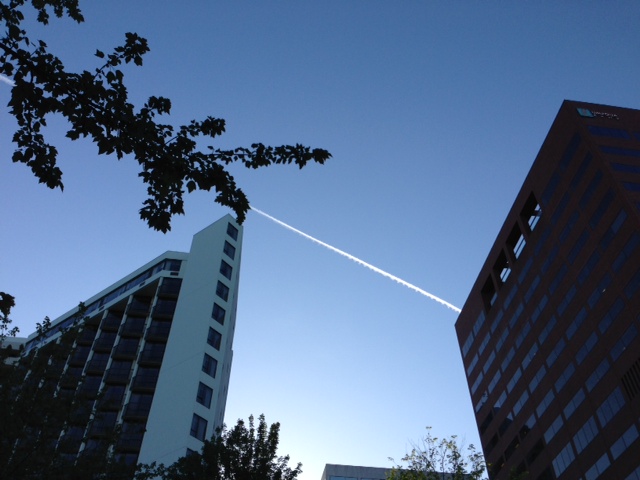 How about this shot from Mike, taken around sunset in downtown Portland. I titled it a ‘contrail tightrope’ because it looked like a rope between buildings! The one on the left is the waterfront Marriott hotel. It’s really one of those ice clouds created by a passing jet and lit up by the setting sun.