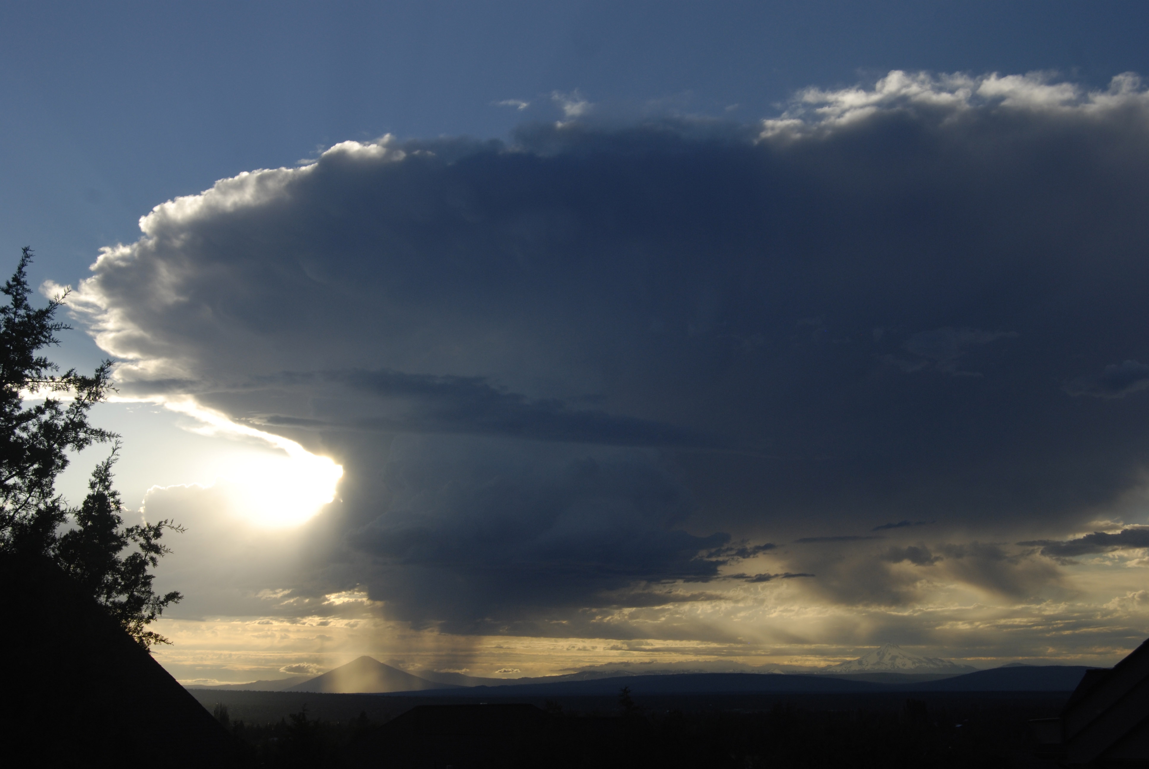 Dave Cleary caught this great shot of a thunderstorm on the second day of summer 2012 as he pointed his camera toward the Cascades from Redmond. If you expand this picture, the black triangular shaped mountain on the left is Black Butte and Mt. Jefferson is snow-capped and on the right.