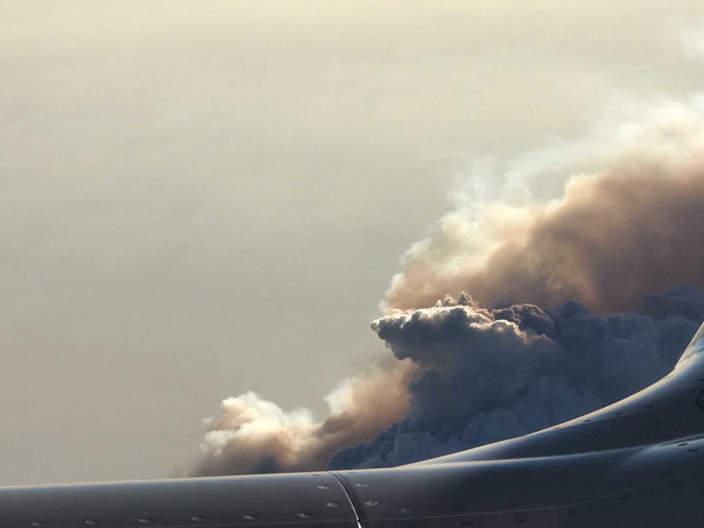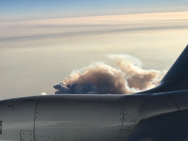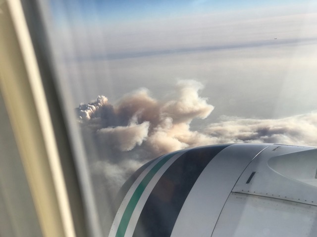 A few minutes later, we were east of Sacramento and Fresno and about halfway between those two cities and that’s when we flew over an area when the fire was raging below, sending a massive plume of smoke into the sky. (Below)